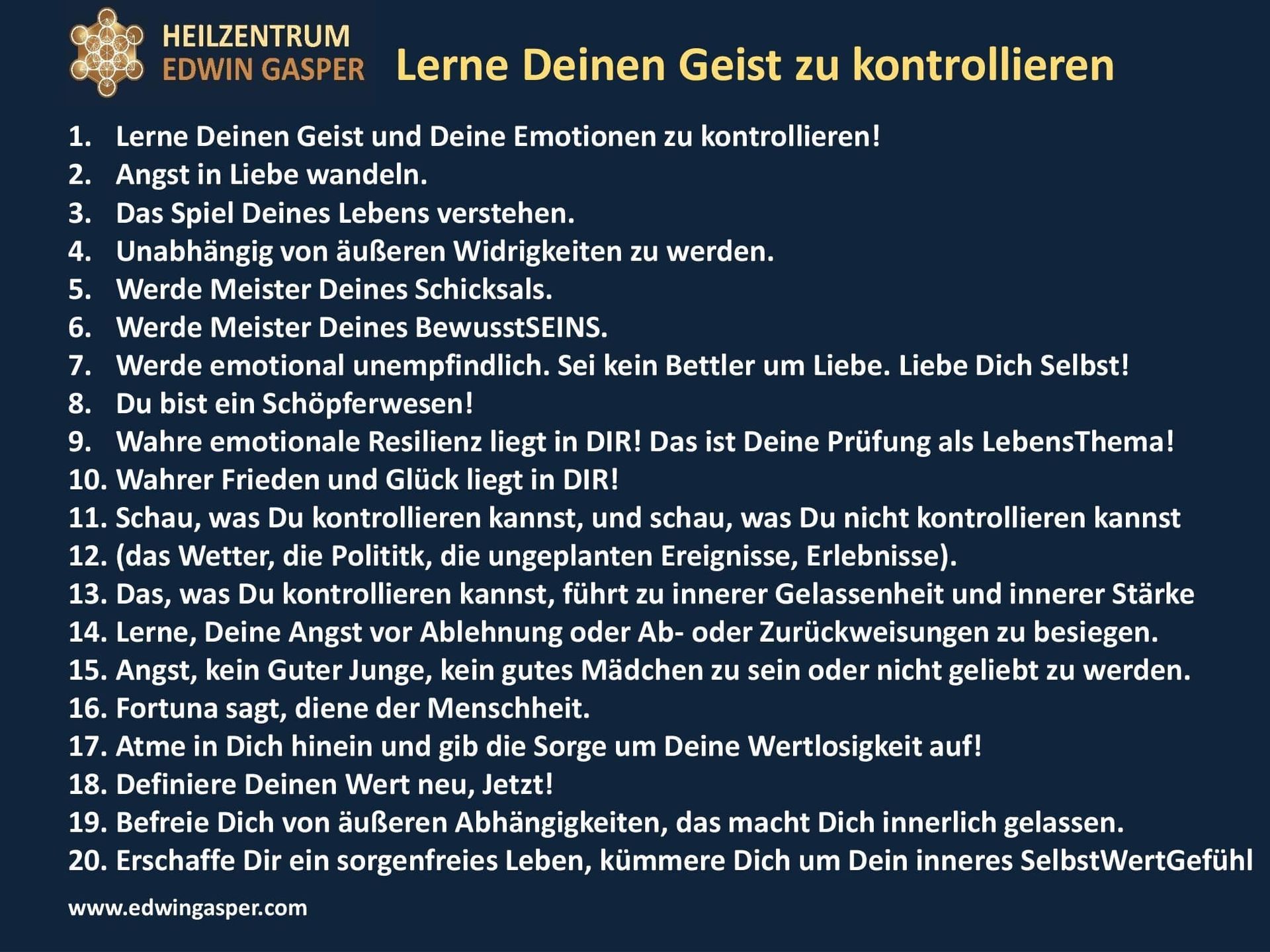 Lernen sie Ihren Geist zu disziplinieren, denn nur ein disziplinierter Geist kann das Gefühl eines erfüllten Wunsches aufrecht erhalten! Sollte sich das vorgestellte nicht verwirklicht haben, dann nur deshalb, weil sie immer noch an Ihren bisherigen Zustand gefesselt sind!