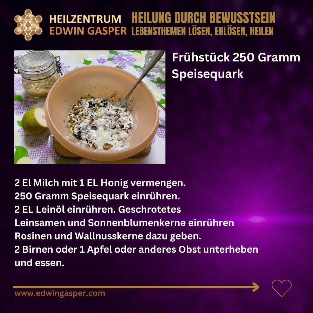 250 ml Speisequark mit etwas Honigmilch verrühren, 1 EL Leinöl, Leinsamen, Rosinen, Sonnenblumenkerne, geschrotete Leinsamen und Wallnüsse